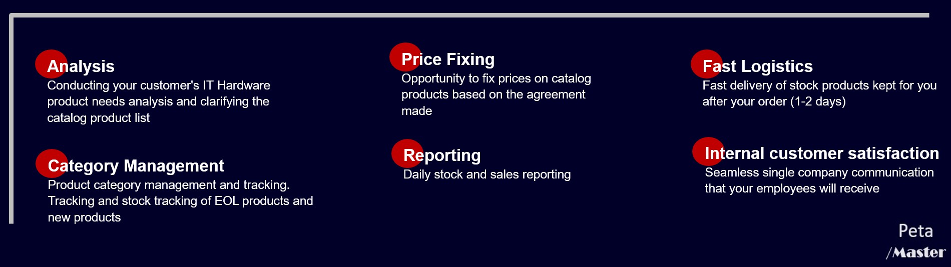 If you avoid keeping stock in IT Hardware products but make routine purchases in certain product groups and encounter different products and different prices by making offers every time, you can avoid these problems with our 6-month and 1-year e-catalogue service! We analyze your IT Hardware needs, keep stock for you and manage the category of stock products with fixed prices. You can obtain your products gradually, as needed, from us with fast logistics. e-Catalogs are an essential part of the Indirect and Direct Supply World.